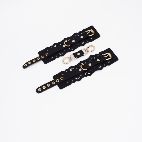 Выполнены наручники из натуральной кожи в лаконичном черном цвете. Фигурные вырезы на манжетах придают образу особенный шарм и подчеркивают нежность женских запястий. Золотая фурнитура придает образу особенную пикантность и подчеркивает отличный вкус владельца!