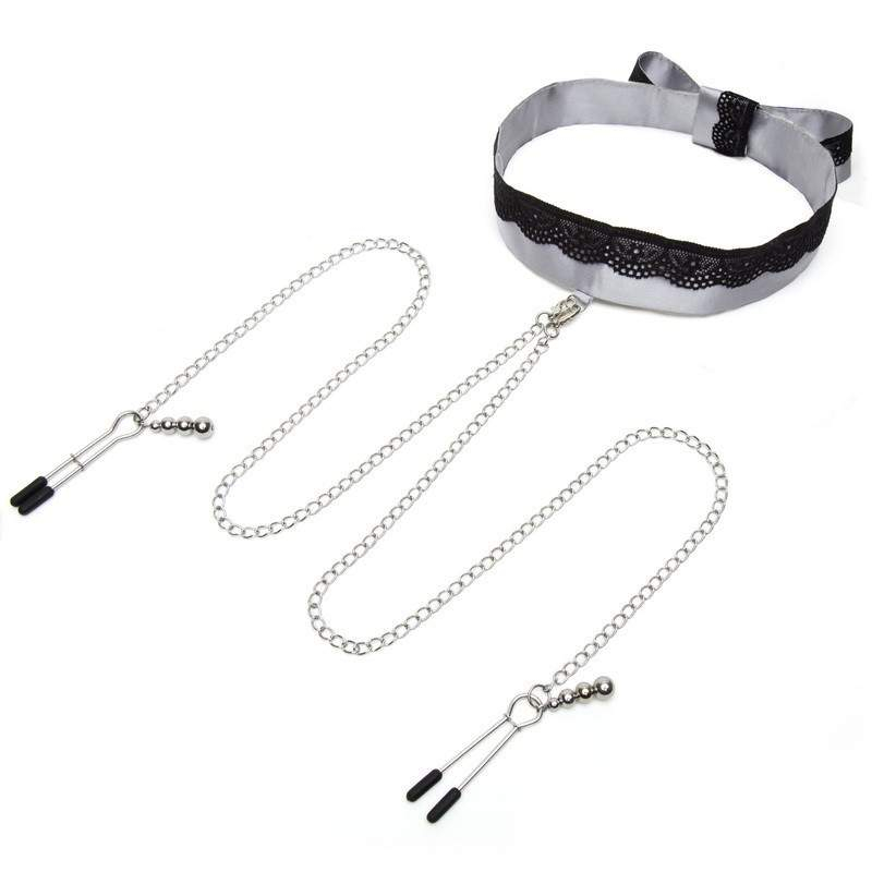 Роскошный ошейник выполнен из серого атласного материала и декорирован нежнейшим черным кружевом. Ошейник не имеет замка, его можно завязать на узел либо на бант. Металлическое D-образное кольцо позволяет крепить к ошейнику различные девайсы